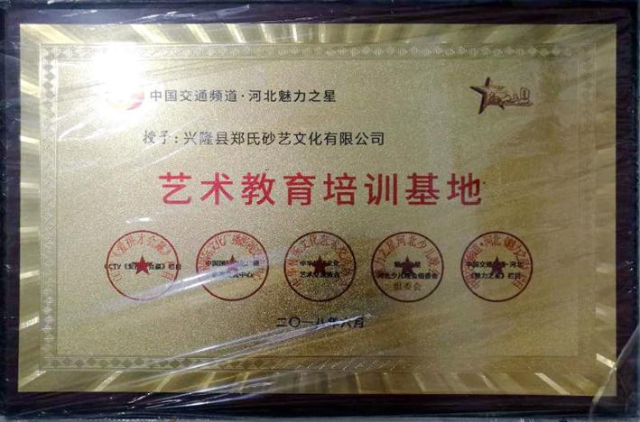 鄭氏砂畫制作榮獲“2018魅力之星河北少兒藝術盛典電視聯歡會”金獎,同時鄭氏砂藝文化有限公司被授予中國交通頻道·河北魅力之星“藝術教育培訓基地”。