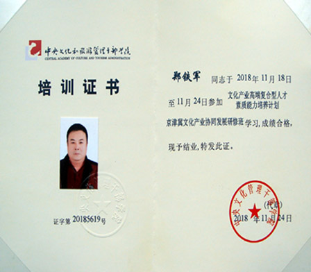 2018年11月18日至24日,興隆縣鄭氏砂藝文化有限公司執行董事鄭鐵軍同志,受邀參加中央文化管理干部學院舉辦的“文化產業高端復合型人才素質能力培養計劃—京津冀文化產業協同發展研修班”學習,于11月24日圓滿結業。