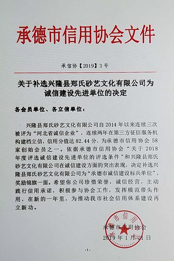 興隆縣鄭氏砂藝文化有限公司榮膺“承德市誠信建設標兵單位”