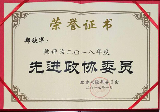2019年1月政協興隆縣委員會為彰顯鄭鐵軍同志在2018年政協工作中的突出表現,特向鄭鐵軍同志頒發《先進政協委員》榮譽證書!