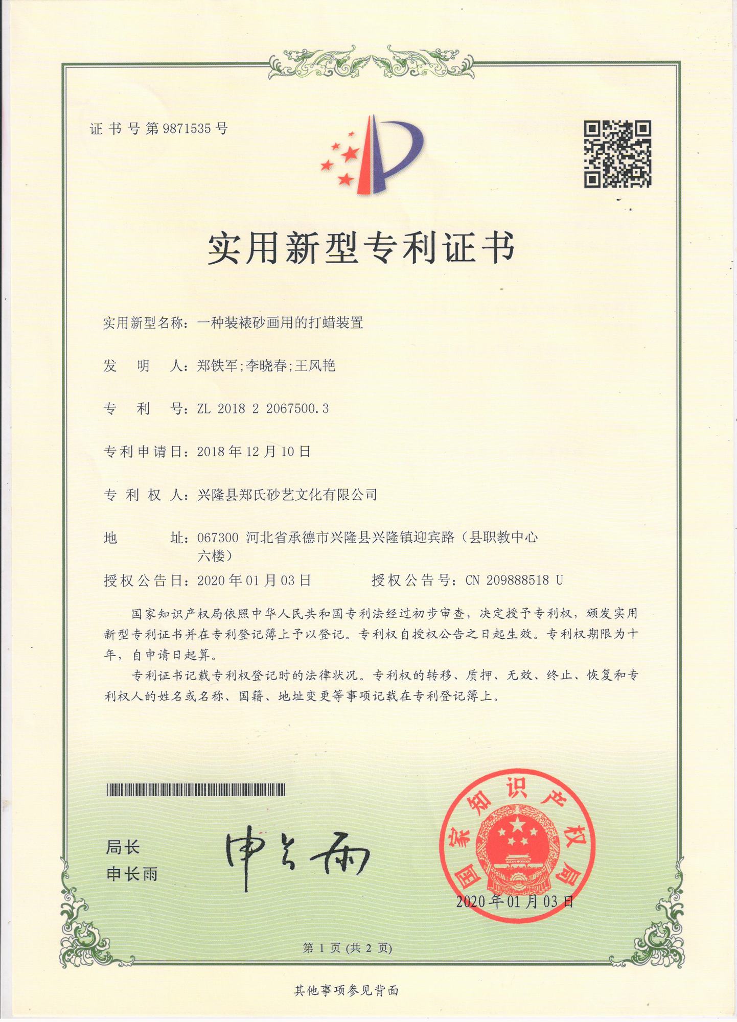 自鄭氏砂藝研究所成立以來,經過研發人員的不懈鉆研和努力,已經陸續研發和申報了9項擁有自主知識產權的實用新型專利,目前為止9項專利全部獲得國家知識產權局的認定。近年來,公司根據自身的生產需求,積極成立了鄭氏砂藝研究所并獲得省工業和信息化廳批準,在研發過程中,公司先后投入數十萬元,通過研發破解了生產過程中的技術難題,9項自主研發專利的成功也標志著鄭氏砂藝研究所逐步走向成熟。