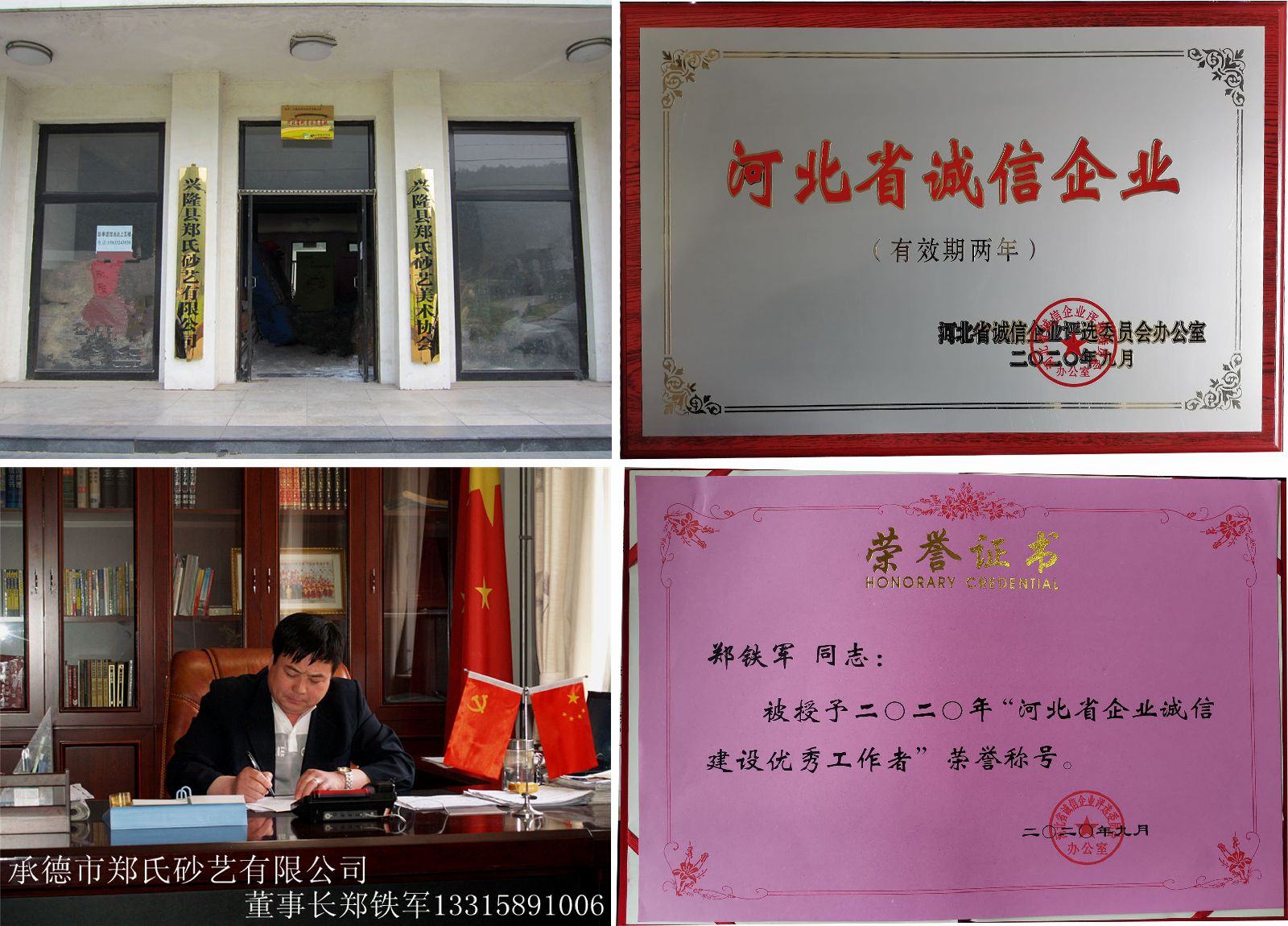 興隆縣鄭氏砂藝文化有限公司董事長鄭鐵軍同志被授予“2020年度河北省企業誠信建設優秀工作者”榮譽稱號。