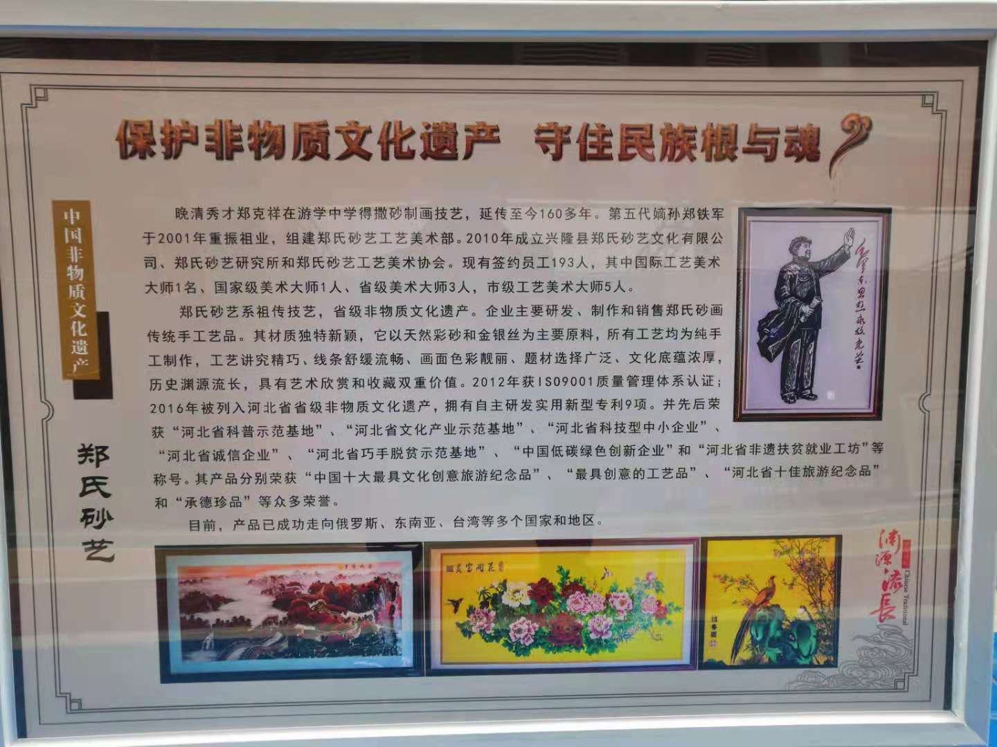 2021年5月15日,鄭氏砂藝應(yīng)邀參加三河市文化廣電和旅游局 “2021 年中國旅游日京津冀文旅資源推介暨 ‘京東文旅圈’成立”系列活動,活動旨在有效推動京津冀協(xié)同發(fā)展重大國家戰(zhàn)略,加快推進興隆縣、遵化市、三河市等京東九縣(市、區(qū))一體化發(fā)展步伐,構(gòu)建文旅定位精準(zhǔn)清晰、資源高效利用、產(chǎn)業(yè)集群發(fā)展的區(qū)域發(fā)展新格局,共同打造京津冀文旅協(xié)同發(fā)展區(qū)。興隆縣旅游和文化廣電局局長莊云飛帶領(lǐng)我縣特色文旅企業(yè)參加了此次活動,其中鄭氏砂藝代表我縣非遺文化產(chǎn)業(yè)出席活動,展出特色砂畫作品51幅,展出效果良好,得到了參觀人員一致好評。