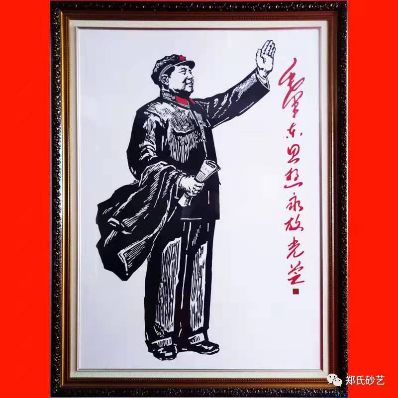 鄭氏砂藝(畫)使用材質(zhì)獨特新奇,以天然彩砂和金銀絲為主要材料,經(jīng)過繪(選)圖、走膠、掐絲、壓砂、裝裱五個純手工制作工藝步驟制成,作出的畫面精煉細(xì)膩,氣韻生動,彰顯出了毛主席胸懷天下的國家領(lǐng)導(dǎo)人氣質(zhì),展出效果良好,得到了參觀人員的一致好評。