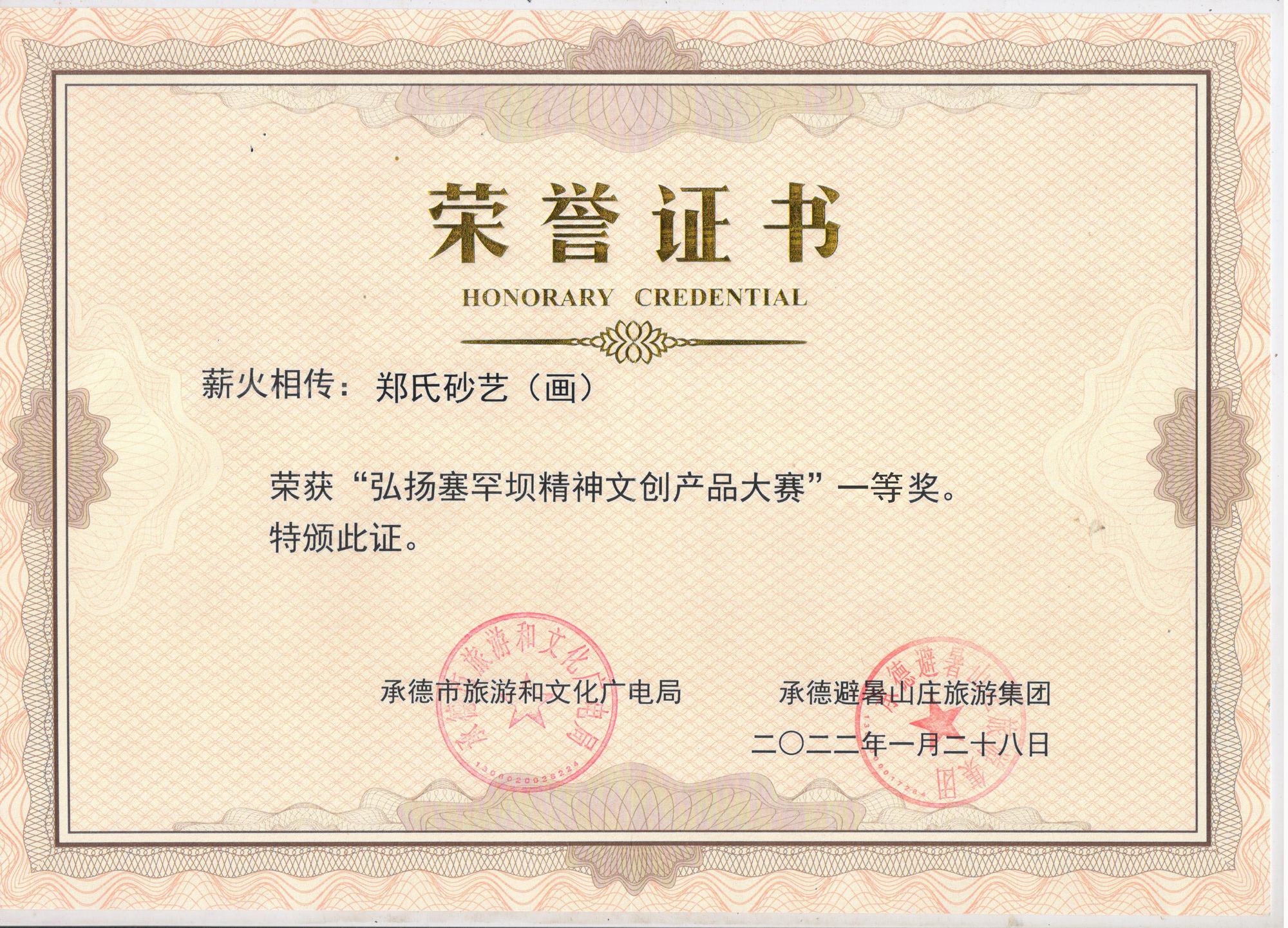近期,鄭氏砂藝多次應邀參加了省、市相關單位舉辦的各項展出活動,參展的非遺砂畫作品和研發的旅游商品得到了社會各界人士的一致好評,被活動組委會給予了很大的肯定,在一定程度上提高了我縣和“非遺”文化鄭氏砂藝的知名度。2021年12月,鄭鐵軍董事長的砂畫作品《長城萬里》入選“多彩非遺 壯美長城”河北省非遺作品主題展,并在河北省“非遺”保護中心展出。2022年1月,鄭氏砂藝砂畫作品《薪火相傳》榮獲“弘揚塞罕壩精神文創產品大賽”一等獎。2022年1月,鄭氏砂藝多項作品在承德市旅游協會舉辦的“傳承非遺手工技藝、助力鄉村振興”活動榮獲獎項。2022年2月,鄭氏砂藝董事長鄭鐵軍在全市開展的“鄉村振興黨旗紅 文藝創新樹先鋒”活動中表現突出,榮獲“承德市2021年度優秀鄉村文藝家會員”稱號。
