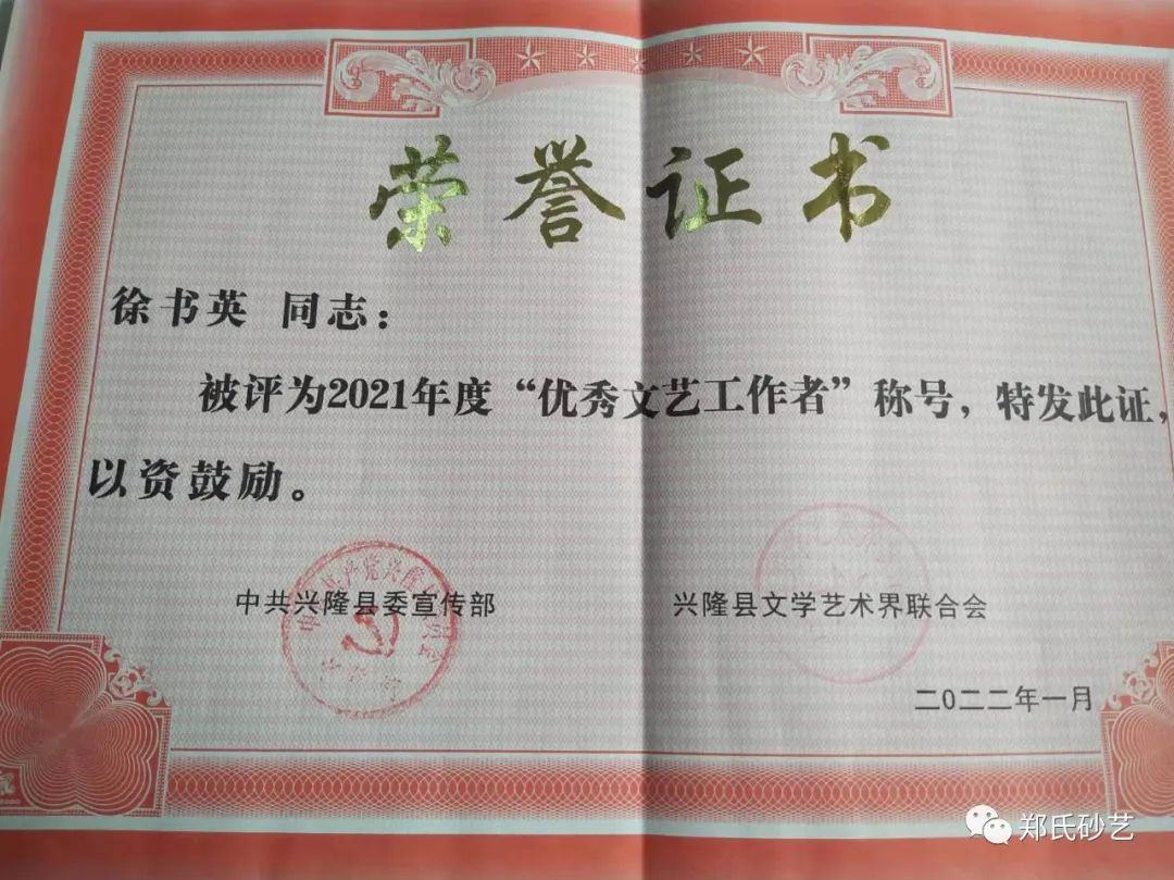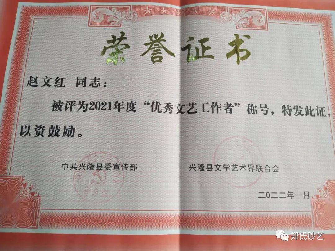近日,縣委宣傳部、縣文聯(lián)發(fā)表了《關(guān)于表彰2021年度優(yōu)秀文藝家協(xié)會、優(yōu)秀村級文聯(lián)、優(yōu)秀企業(yè)文聯(lián)、優(yōu)秀文藝工作者的決定》,文中指出“2021年,在縣委、縣政政府的堅強(qiáng)領(lǐng)導(dǎo)下,在市文聯(lián)的直接指導(dǎo)下,全縣廣大文藝工作者,深入學(xué)習(xí)貫徹黨的十九大和習(xí)近平文藝座談會上的講話精神,在‘鄉(xiāng)村振興黨旗紅·文藝創(chuàng)新樹先鋒’和‘文藝名村’建設(shè)實踐活動中,辛勤耕耘,積極創(chuàng)作,服務(wù)人民,為繁榮全縣文藝事業(yè)做出了積極貢獻(xiàn),涌現(xiàn)出了一大批表現(xiàn)突出、成績優(yōu)異的文藝工作者。”在此次通報表彰中,鄭氏砂藝董事長鄭鐵軍、徐書英、王鳳艷、趙文紅、張國新、王建寶、張玉紅、張秀榮、王婷共9人被縣委宣傳部和縣文聯(lián)授予2021年度“優(yōu)秀文藝工作者”稱號。企業(yè)將繼續(xù)開拓創(chuàng)新,潛心創(chuàng)作,努力發(fā)掘出更多文藝人才,壯大鄭氏砂藝藝術(shù)研究所,創(chuàng)作出更多文藝精品,為推進(jìn)新時代興隆縣文藝事業(yè)繁榮發(fā)展作出新的更大貢獻(xiàn)。