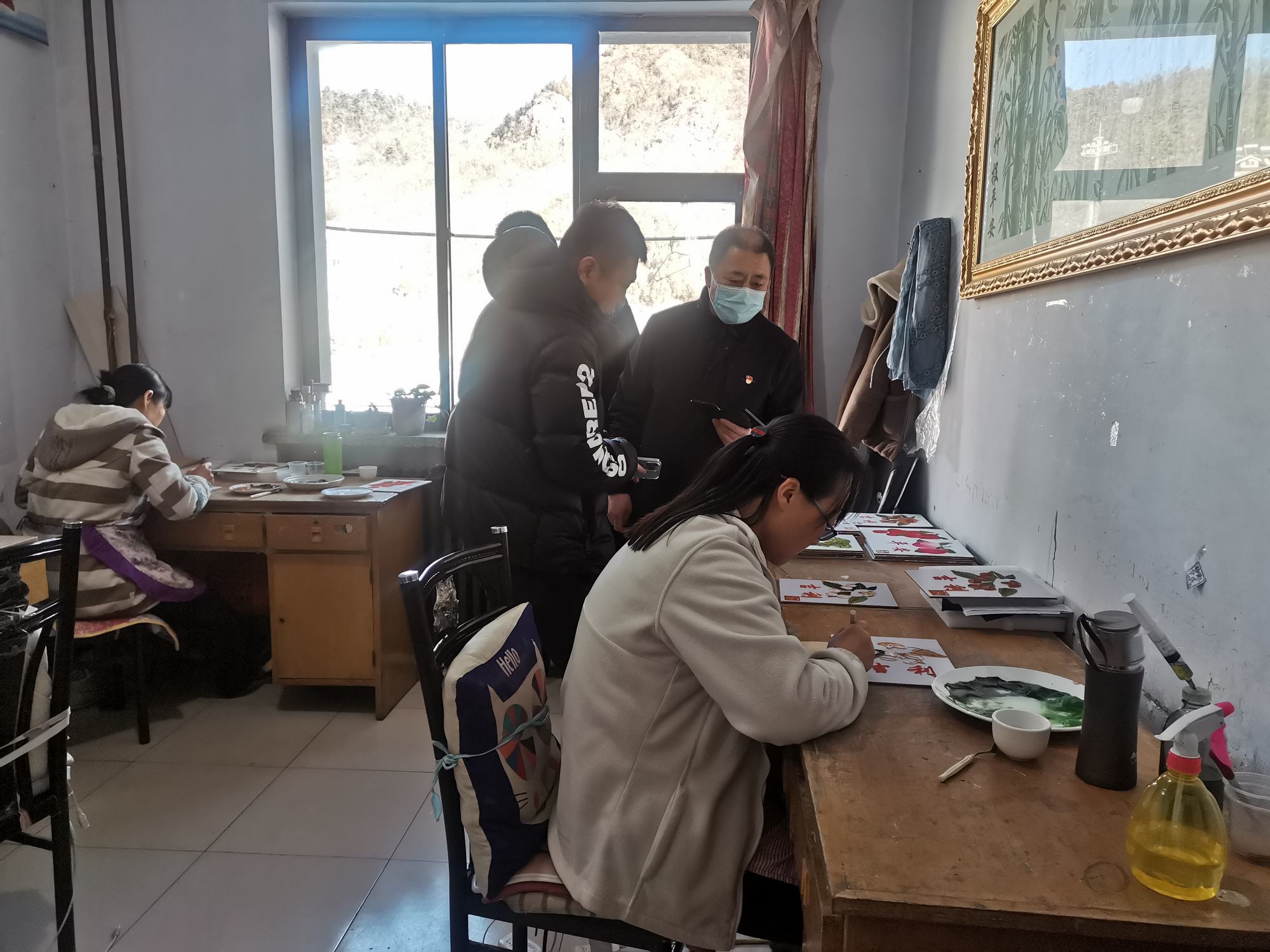 隨后,李曉軍主任和趙楠主任參觀了鄭氏砂藝生產(chǎn)車間,觀看了砂畫制作材料和制作過程,并對砂畫的研發(fā)方向給予了建設(shè)性的指導(dǎo)。