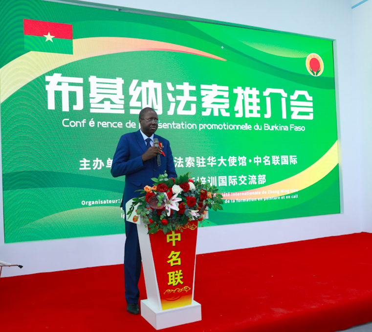 (中名聯(lián)文創(chuàng)園圖片說(shuō)明:布基納法索共和國(guó)駐華大使館領(lǐng)導(dǎo)帕爾﹣伊薩﹣約瑟夫先生上臺(tái)演講,明確表示非常開心在中名聯(lián)國(guó)際展廳舉辦布基納法索國(guó)家推介會(huì))