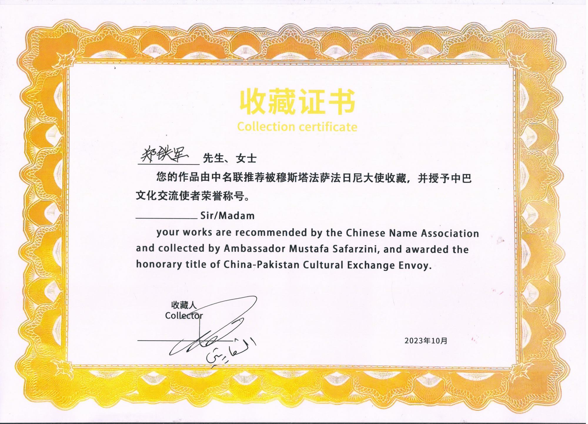 2023年10月29日,應中名聯邀請,并通過中名聯國際平臺,鄭氏砂藝執行董事長鄭鐵軍同巴勒斯坦駐華大使穆斯塔法·薩法日尼展開了真摯而又熱情的交流,大使表示十分尊重和熱愛中國的傳統文化,尤其是高度贊賞了鄭氏砂藝(畫)在藝術方面達到的深厚造詣,并將鄭鐵軍砂畫作品《牡丹》選作國禮正式收藏,同時授予鄭鐵軍為中巴文化交流使者榮譽稱號。