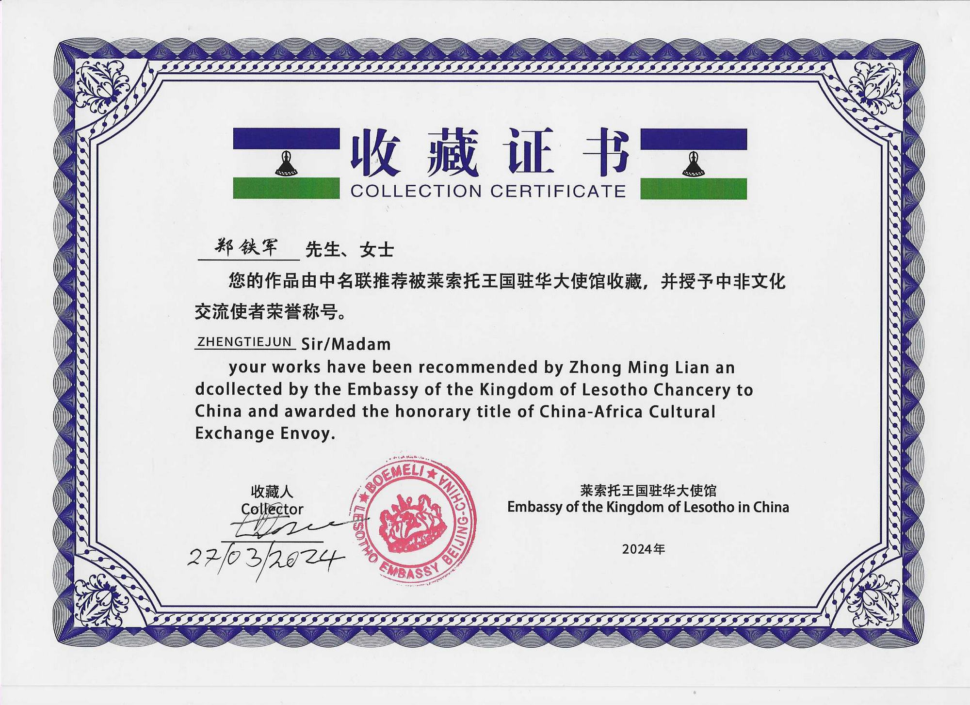 萊索托王國(guó)駐華大使邀請(qǐng)中名聯(lián)國(guó)際趙萍女士推薦的中名聯(lián)簽約國(guó)禮藝術(shù)家鄭鐵軍,于2024年3月26日至27日上午前往萊索托王國(guó)駐華大使館進(jìn)行中萊文化交流。萊索托駐華外交官杜麥羅.莫塞邁公使銜參贊對(duì)趙萍女士和鄭鐵軍先生的到來(lái)表示熱烈歡迎。在萊索托王國(guó)駐華使館會(huì)客廳中,鄭鐵軍向杜麥羅.莫塞邁介紹了鄭氏砂藝(畫(huà))藝術(shù)特點(diǎn)和文化內(nèi)涵,萊索托王國(guó)外交官對(duì)鄭鐵軍的作品給予高度評(píng)價(jià),對(duì)傳統(tǒng)文化藝術(shù)鄭氏砂藝(畫(huà))所蘊(yùn)含的深厚中華文化底蘊(yùn)極其贊賞,現(xiàn)場(chǎng)將鄭鐵軍的作品《國(guó)色天香》作為國(guó)禮永久收藏。杜麥羅.莫塞邁公使銜參贊表示非常榮幸,愿意將更多的鄭氏砂藝(畫(huà))作品贈(zèng)送全球友華政要,成為中國(guó)文化國(guó)際傳播橋梁,隨后,親筆簽名收藏證書(shū),并授予鄭鐵軍中非文化交流使者榮譽(yù)稱號(hào)。