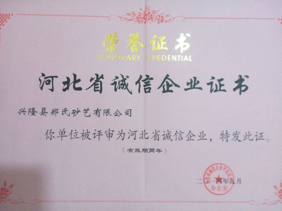 2014年9月26日,鄭氏砂藝有限公司被評為2014年“河北省誠信企業”,公司的事跡同時錄入《河北省企業誠信建設成果集》一書中。“河北省誠信企業建設交流會”暨“河北省誠信企業”授牌儀式9月26日在省會石家莊凱旋金悅大酒店舉行,公司總經理鄭鐵軍參加了授牌儀式。鄭鐵軍總經理同時被評為“2014年度河北省企業誠信建設優秀工作者”。