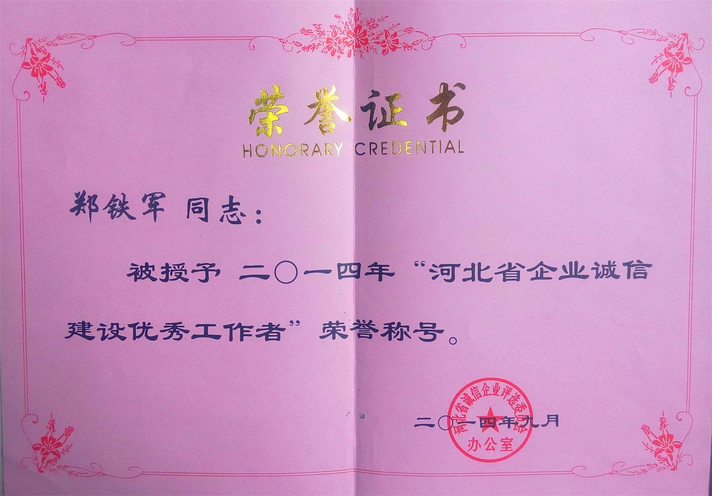 9月26日,河北省誠信企業評選委員會辦公室和河北省企業家協會同省有關部門通報表彰“河北省誠信企業”及“河北省企業誠信建設優秀工作者”。興隆縣鄭氏砂藝有限公司榮獲“河北省誠信企業”榮譽稱號;公司總經理鄭鐵軍被授予“河北省誠信企業建設優秀工作者”榮譽稱號。“河北省誠信企業”及“河北省企業誠信建設優秀工作者”評選活動每兩年組織開展一次。2014年,經過公司申報、基層相關部門審查推薦、省相關主管部門復審、評審專家委員會審核評選、社會公示等程序獲此稱號。這是公司首次獲此殊榮。