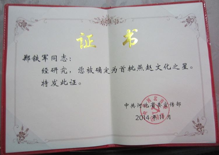 2014年11月,鄭鐵軍同志被省委宣傳部確定為《首屆河北省燕趙文化之星》。同時與他獲此殊榮的還有縣文化館副館長錢飛龍同志。