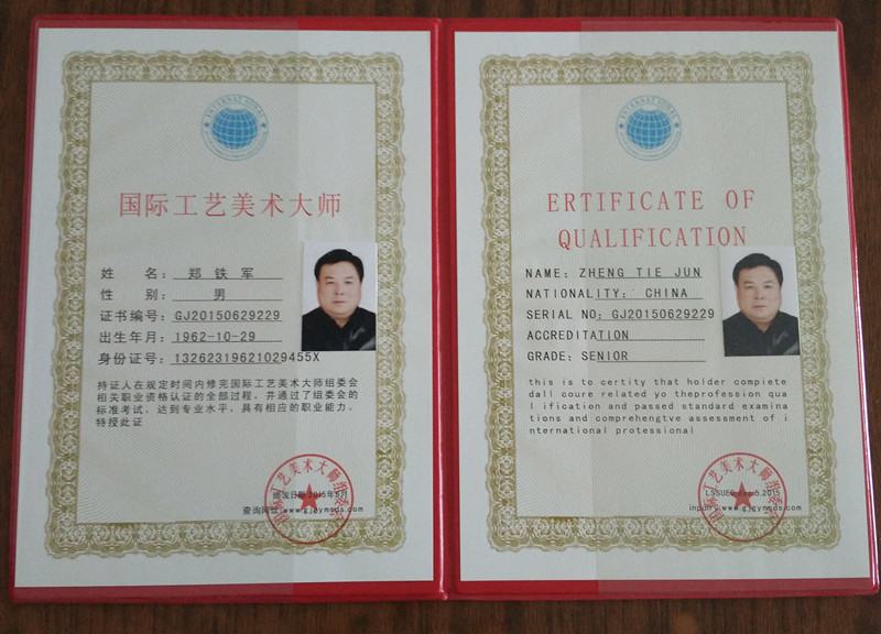 2015年6月,本公司總經理鄭鐵軍先生,在規定時間內修完國際工藝美術大師組委會相關職業資格認證的全部過程,并通過了國際工藝美術大師組委會的職業資格標準考試,達到專業水平,具有相應的職業能力,特授“國際工藝美術大師”稱號。
