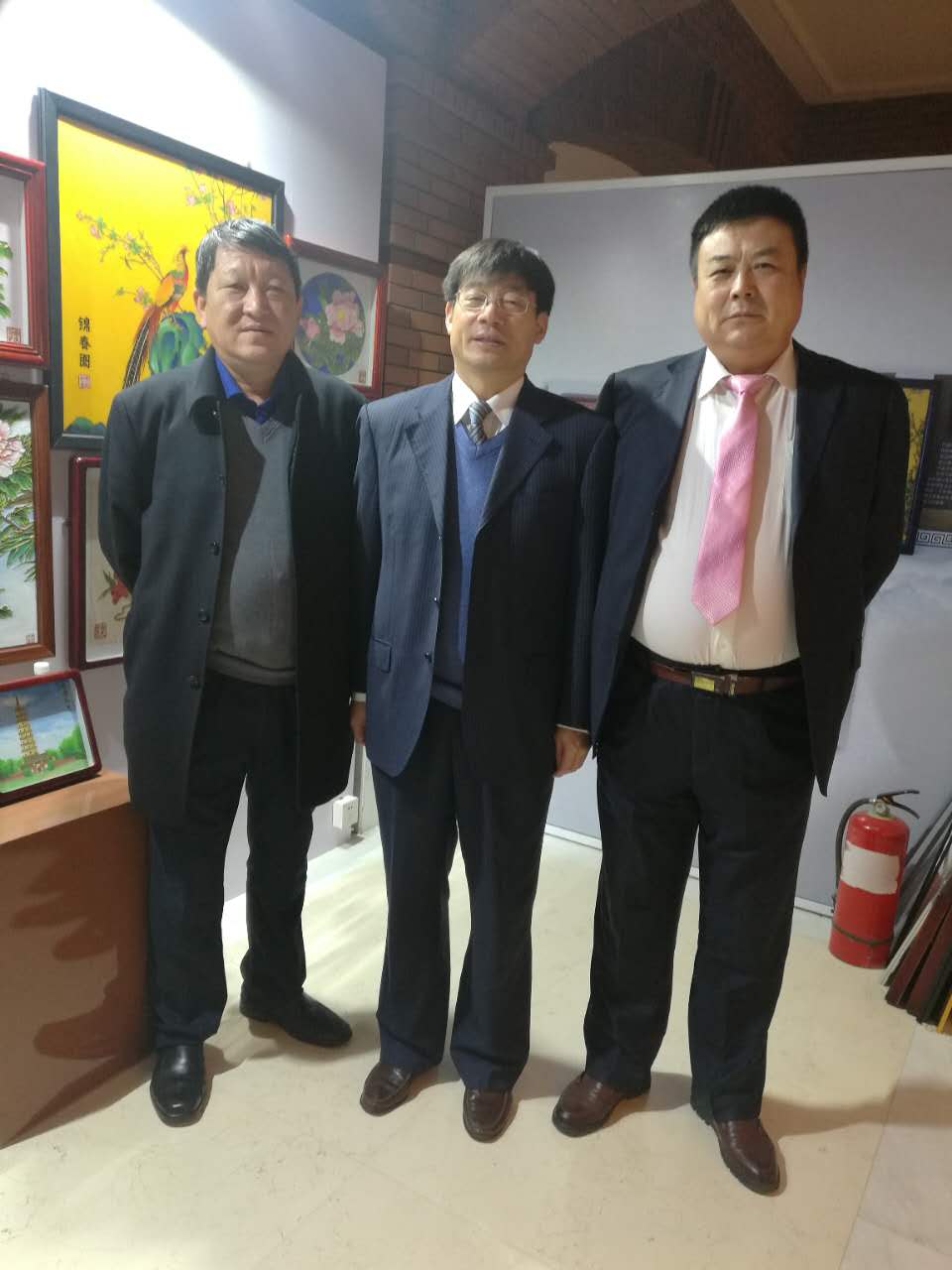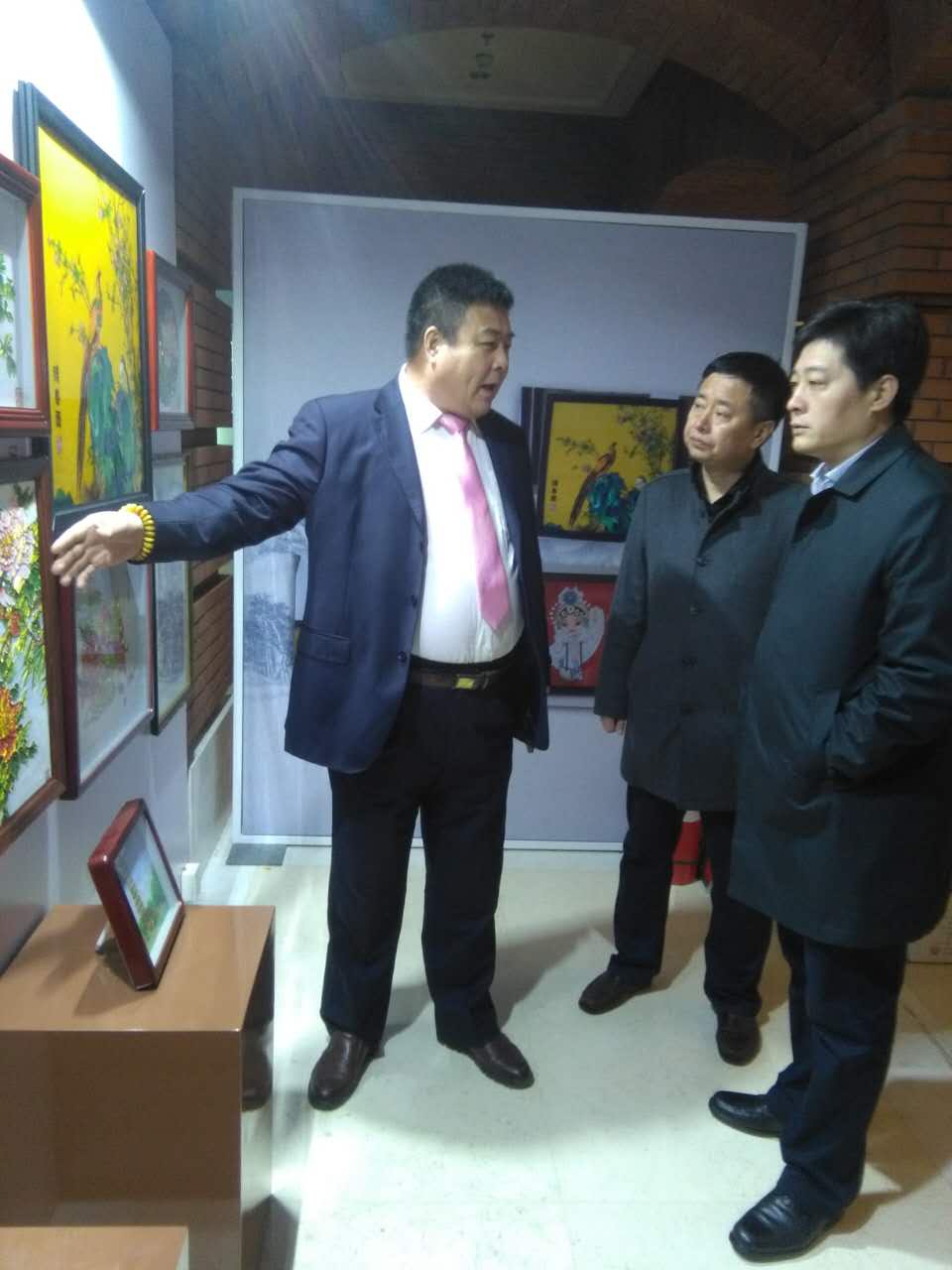 鄭總在向興隆縣副縣長高春青(中)、天津市北辰區人民政府合作交流辦公室主任陳炳坤(右)介紹砂畫特色工藝。
