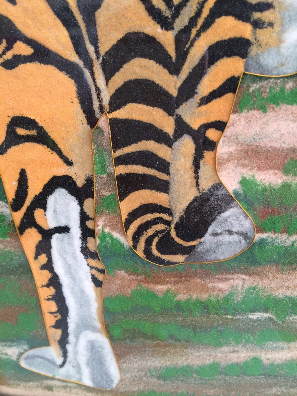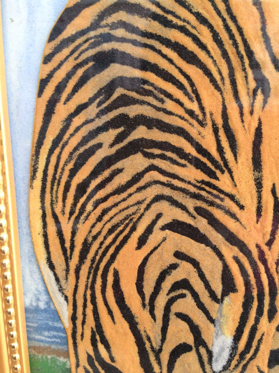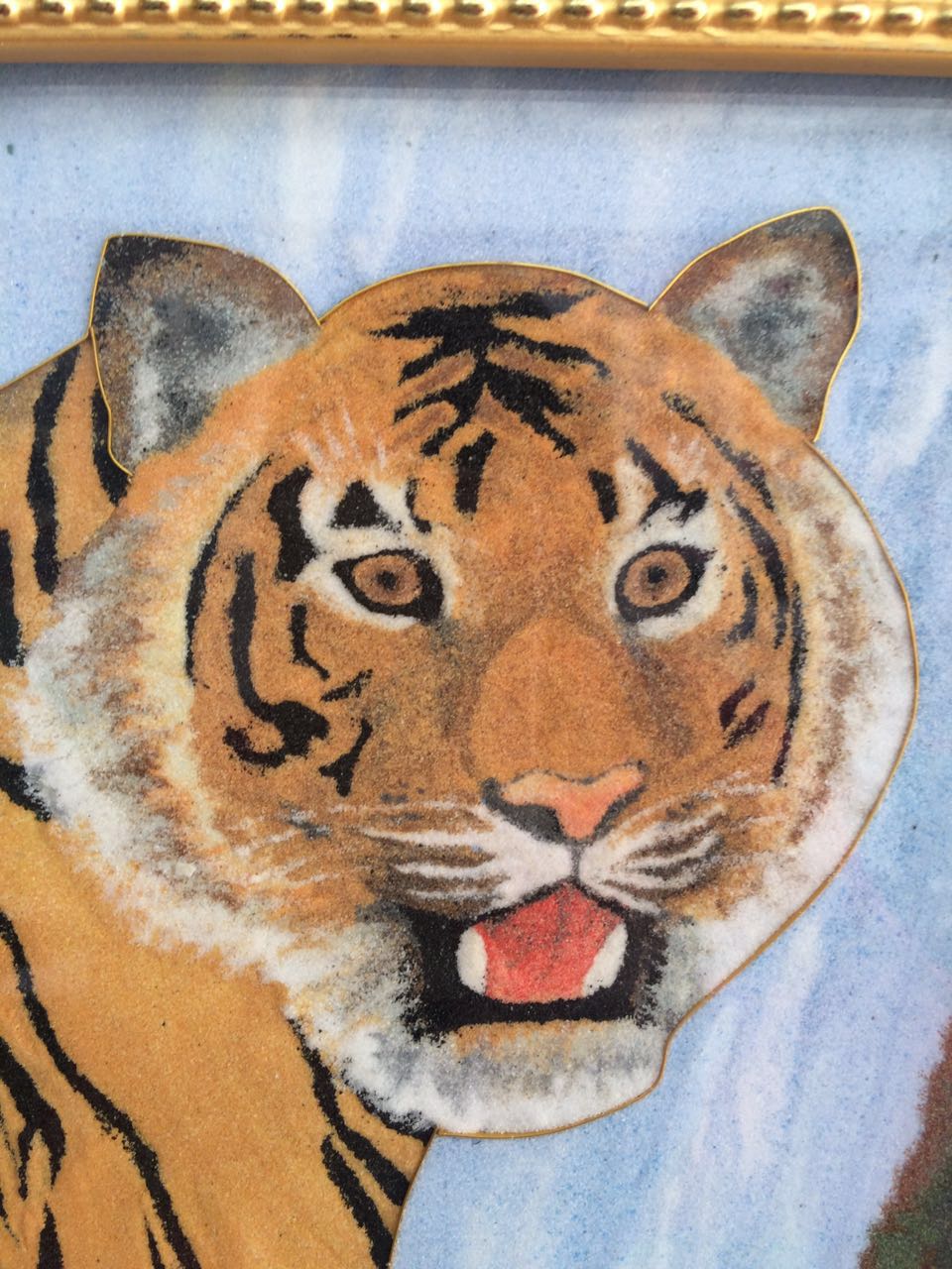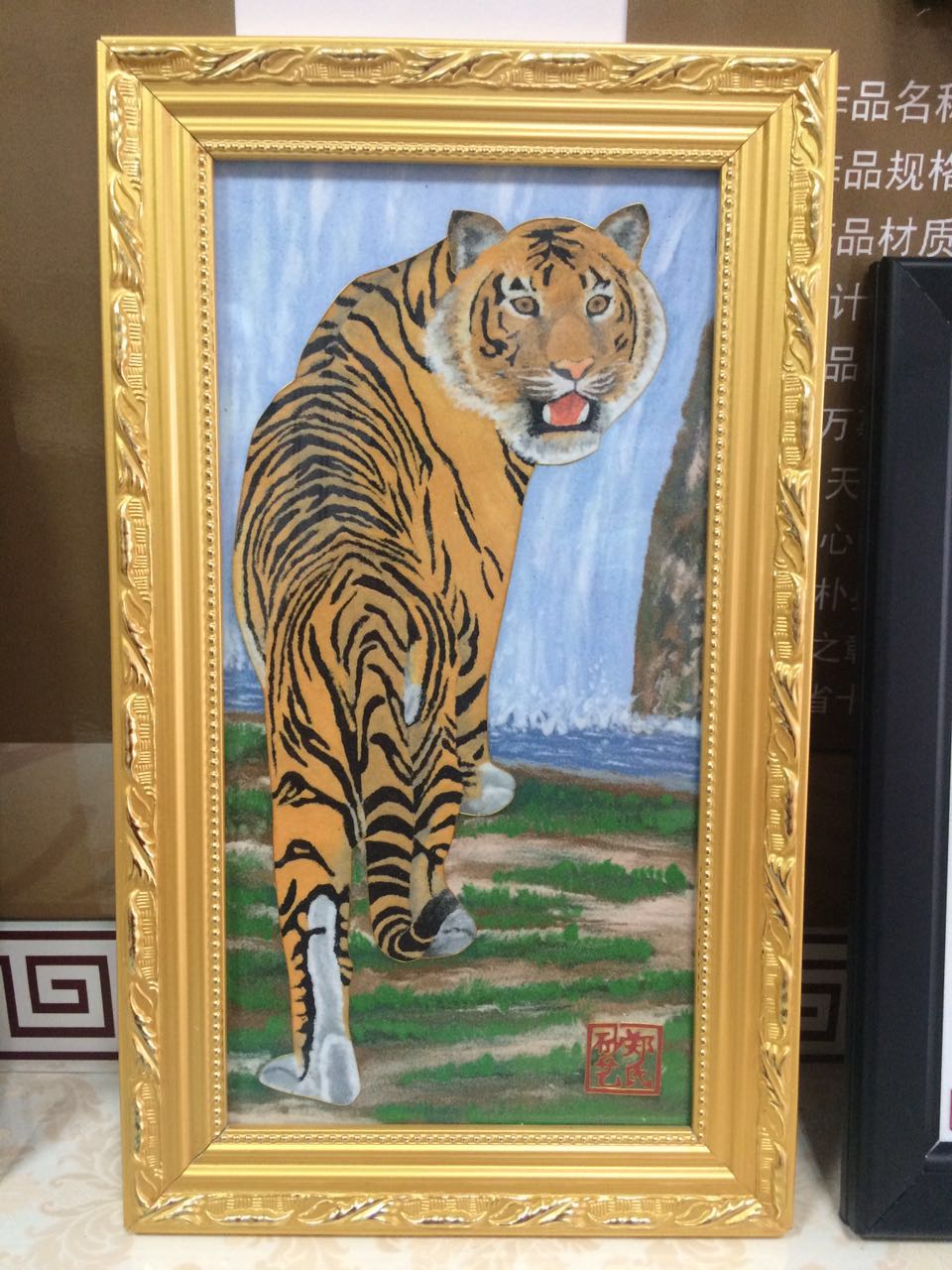 《老虎》28*58*3.5cm(長*寬*高),該產(chǎn)品以老虎作為畫的主題, 老虎屬大型貓科動物;毛色淺黃或棕黃色,滿有黑色橫紋;頭圓、耳短,耳背面黑色,中央有一白斑甚顯著;四肢健壯有力;尾粗長,具黑色環(huán)紋,尾端黑色。鄭氏金絲彩砂畫采用金銀絲與彩砂結(jié)合,填制出一只威猛的老虎。